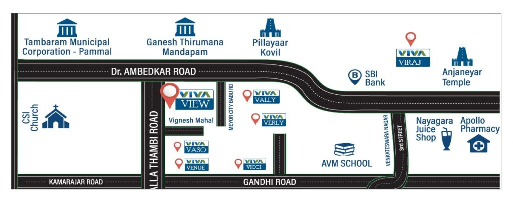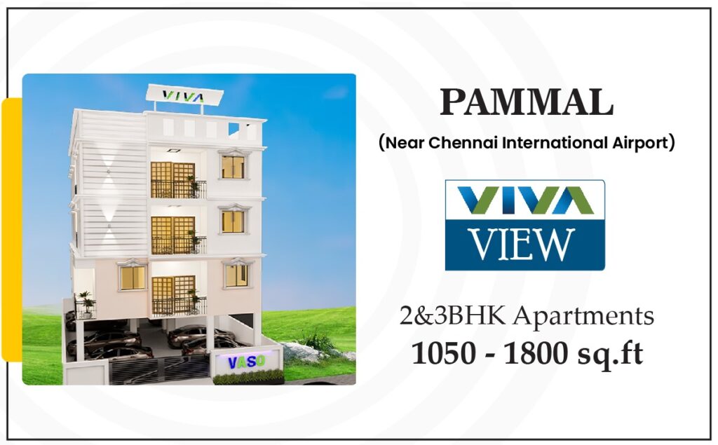 Situated in the heart of the Pammal Hotspot, VIVA-VIEW unveils a collection of 2 and 3 BHK luxury apartments ranging from 1050 to 1800 sq. ft. These residences redefine opulence, perfectly positioned in the thriving locale of Pammal. Experience the epitome of refined living as contemporary aesthetics merge seamlessly with practicality. Each dwelling is a testament to sophistication, with meticulously crafted interiors and modern fixtures. From the capacious living area to the exquisitely designed bedrooms, VIVA-VIEW residences offer a harmonious blend of expansiveness and cosiness, catering to the thriving needs of families and enabling the flourishing of individuals in the vibrant Pammal Hotspot